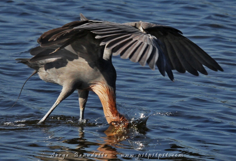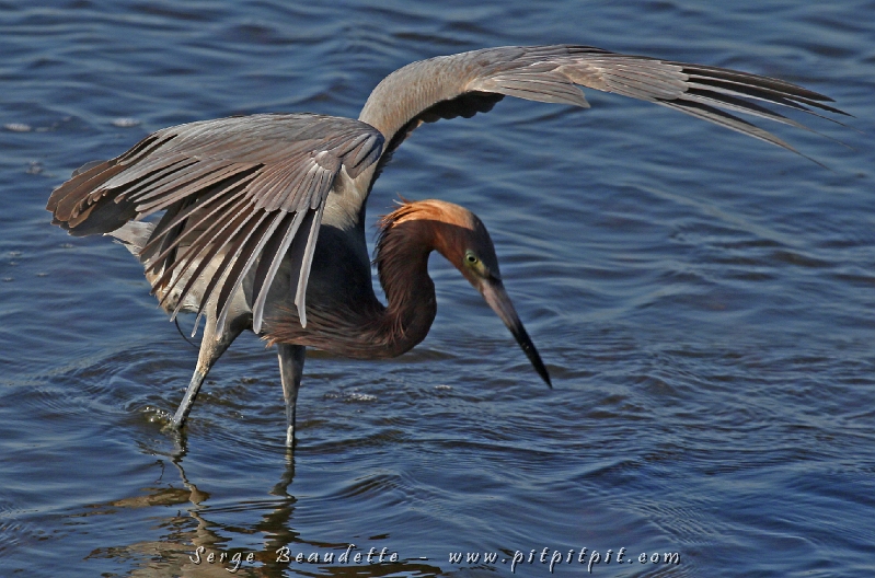 L’Aigrette roussâtre exécute sa danse toutes ailes déployées, pour éviter de trahir sa forme de prédateur… et surtout pour couper le reflet du ciel et mieux voir sous la surface! D’une incroyable rapidité, elle réussit souvent ses captures!