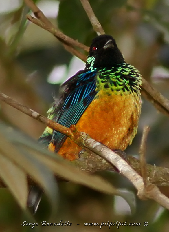 Et ENFIN! Après DES ANNÉES de tentatives, ma PREMIÈRE bonn photo du Calliste pailleté! Un plumage absolument original!!! Des paillettes lumineuses vert fluo sur la poitrine, sur fond noir, des plumes d’ailes noires aux bordures bleu lumineux, un ventre roux, une nuque turquoise, des yeux rouges! Je ne sais pas où il s’habille mais c’est une mode unique!!!