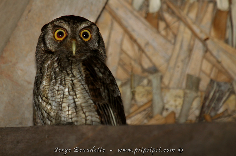 …D’autres fois, les énormes insectes qui volent autour des lumières de la salle à manger attirent des prédateurs comme ce magnifique Petit-Duc de Cooper!!! …La veille, une énorme blatte avait fait trois tours du globe en volant avant de s`accrocher sur le mur directement derrière moi. J’ai mis pas plus de 2 secondes à étirer ma chaise pour monter dessus pour voir la créature et avant que je me rende, le Petit-Duc a fait irruption dans la salle, a attrapé la blatte et est sorti aussitôt pour la manger sur une branche à côté!!! Personne ne croyait mon histoire… mais il est arrivé la même chose ce soir… preuve à l’appui!