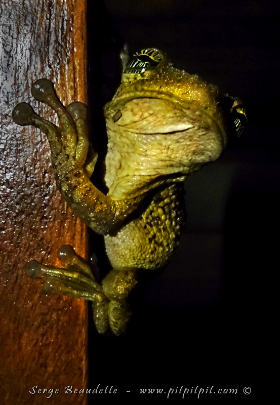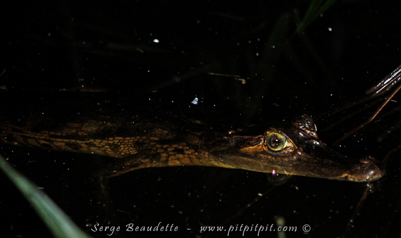C’est aussi par les yeux, qui réfléchissent les lumières des frontales à très longue distance, que je repère plusieurs Caïmans noirs, dans les lagunes qui bordent le lodge!
