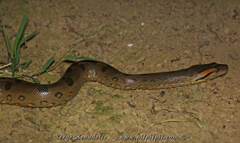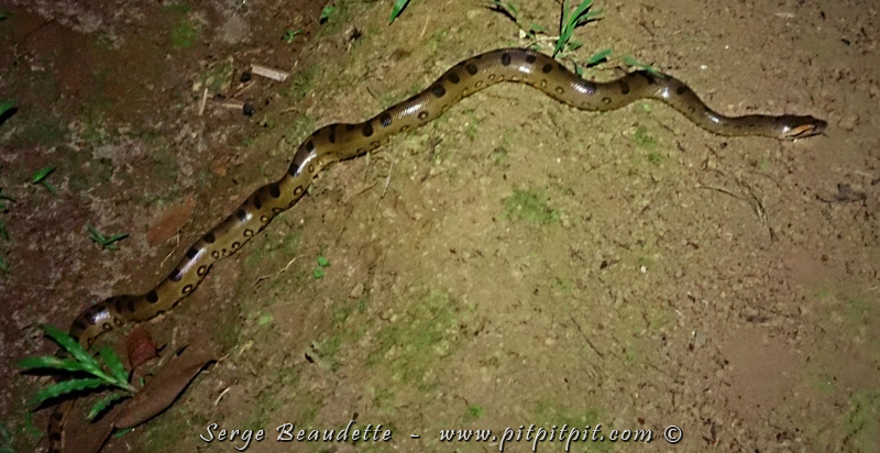 MA PLUS GROSSE SURPRISE… Littéralement un GRAND SOUHAIT de mon séjour en Amazonie… Petite introduction : la veille, j’ai vu un Boa constrictor que je ne suis pas arrivé à attraper… Cette nuit, je tombe sur ce magnifique serpent de 1,5 mètre environ… Je pense à un python… et ça m’est confirmé le lendemain… Toutefois, quand j’en parle à mon ami équatorien Xavier le lendemain, lui qui connaît vraiment bien les reptiles, il me dit qu’il n’y a pas de python en Amérique du Sud… Ses yeux s’ouvrent tout grands et il me demande de lui montrer la photo… Je commence à comprendre… (à suivre…)