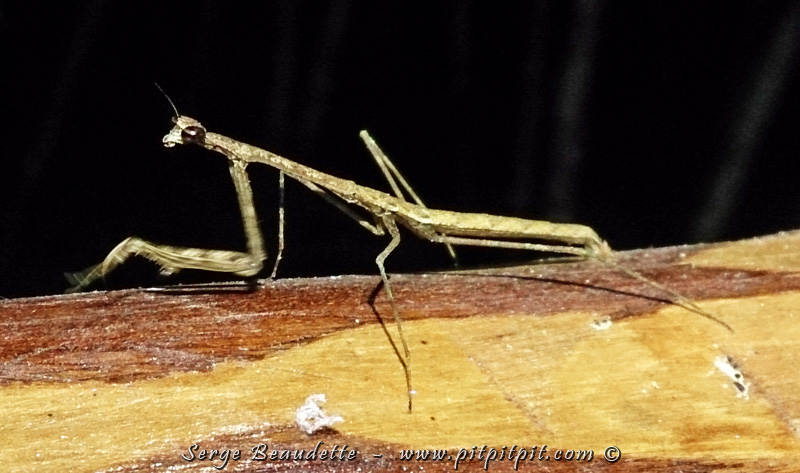 Comme je l’annonçais hier, la dernière nuit m’a réservé beaucoup de surprises! …Il faut dire que je reste dans l’aire commune le dernier et jusqu’à 2h du matin parfois, le temps de préparer les blogues que vous recevez… Mes récompenses sont vos messages en retour… ET! …la faune nocturne qui me surprend chaque fois! Les lampes de la salle à manger attirent des insectes comme cette Mante religieuse!