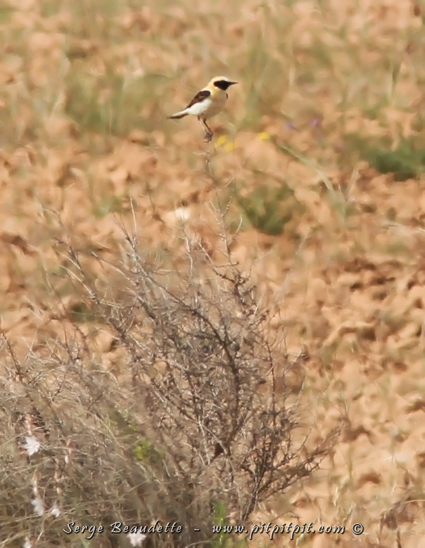 En moins de 5 minutes, il est à nouveau à découvert, sur un buisson cette fois… et… l’impossible se produit: nous arrivons à mettre 5 télescopes sur « la bête », et TOUT LE MONDE passe et repasse, d’une lunette à l’autre pendant au moins 15 minutes, jusqu’à satiété, sur l’oiseau qui s’exibe encore!!!!!!!! Du JAMAIS vu, qui tient plus du MIRACLE que de la CHANCE!!!!!!!