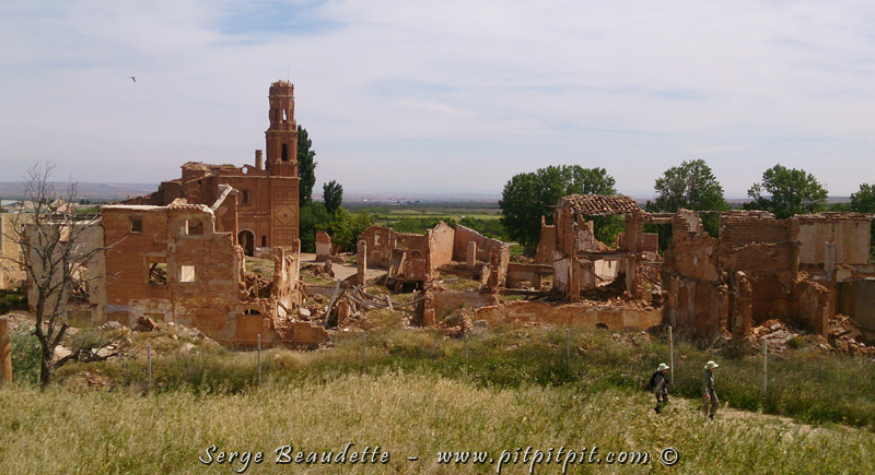 Nous reprenons la route, admirons les paysages qui changent et s’alternent jusqu’à notre destination: Belchite. C’est une ville reconstruite après la destruction de l’ancien Belchite durant la guerre civile, dont les ruines sont les témoins de cette période de misère d’autrefois. Nous ferons une très courte visite de cet ancienne ville, où il n’y a que les ruines… Ça fait contraste avec la nature dans laquelle nous baignons depuis 10 jours… une nature qui vit en harmonie et dont les congénères d’une même espèce se respectent… De voir ce que les humains peuvent se faire vivre les uns les autres pour des divergences d’opinions…