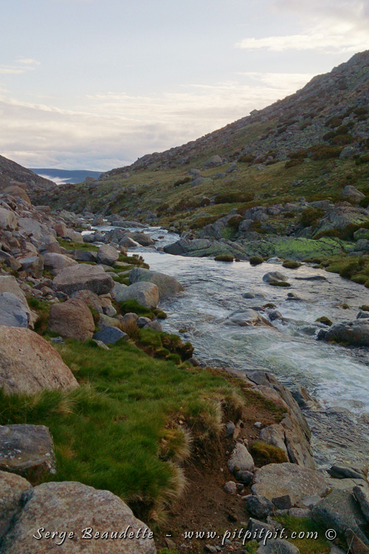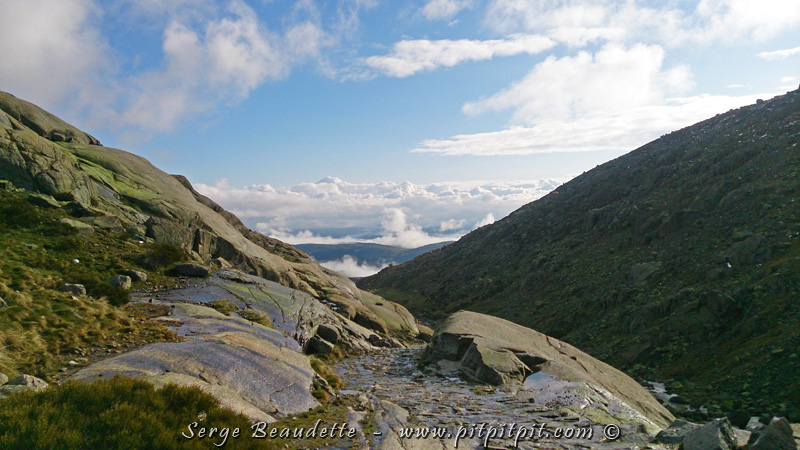 Mon coup de coeur? Ce qui fait que je n’arrête pas, que je ne passe pas une minute complète sans un « ah! », une exclamation, un soupir de contentement? Nous sommes par-dessus les nuages, la température est fraîche et bonne, le soleil est radieux, et par dessus tout, nous sommes sur un sentier de pierres plates qui monte dans une vallée au bord d’une rivière pure, qui coule entre des falaises et parois hautes, colorées par les mousses et lichens! C’est vraiment un PARADIS DE BEAUTÉS!!!