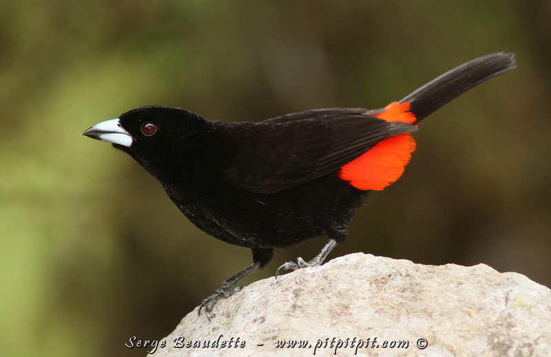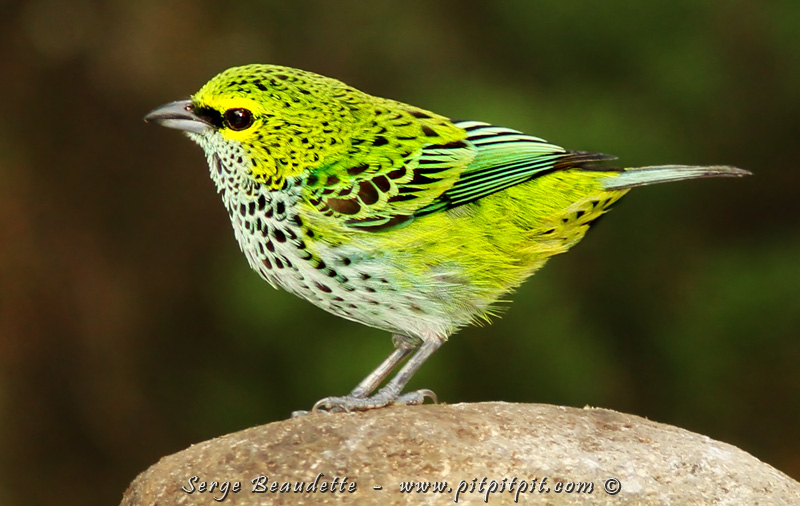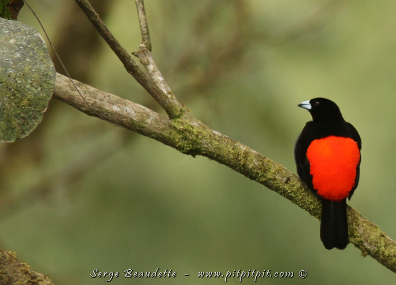 Pour vous donner un aperçu de la diversité des oiseaux ici, dans ses formes et SES COULEURS, voici quelques espèces (seulement) parmi toutes celles qui viendront juste devant nous, dans la première demi-heure, au poste d’alimentation! J’ai pris la même roche pour vous montrer! D’abord, le mâle Tangara de Cherrie, avec son croupion spectaculaire! …Il est identique au mâle Tangara à croupion rouge que je vous ai présenté il y a quelques jours…