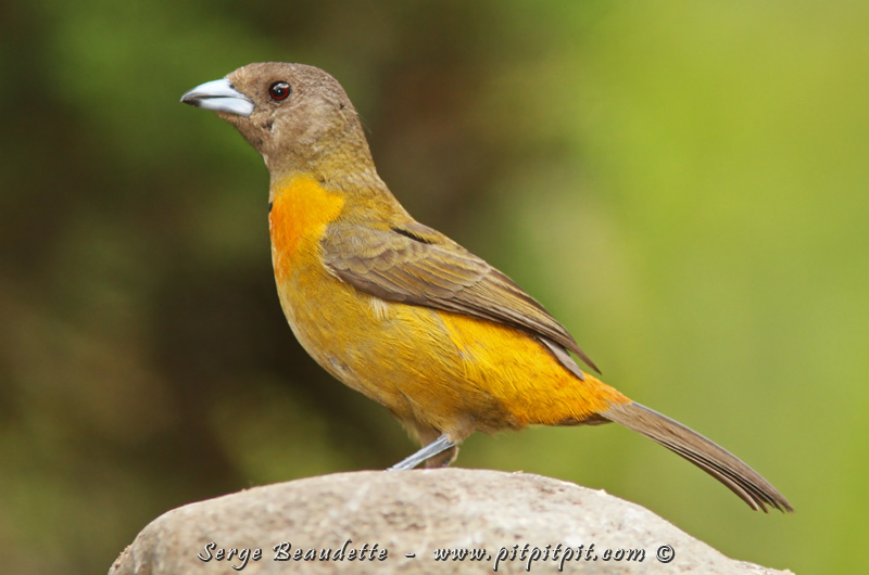 Alors que les mâles des 2 espèces sont identiques, la femelle du Tangara de Cherrie (ici), a plus de couleurs que la femelle « à croupion rouge » des jours précédents…