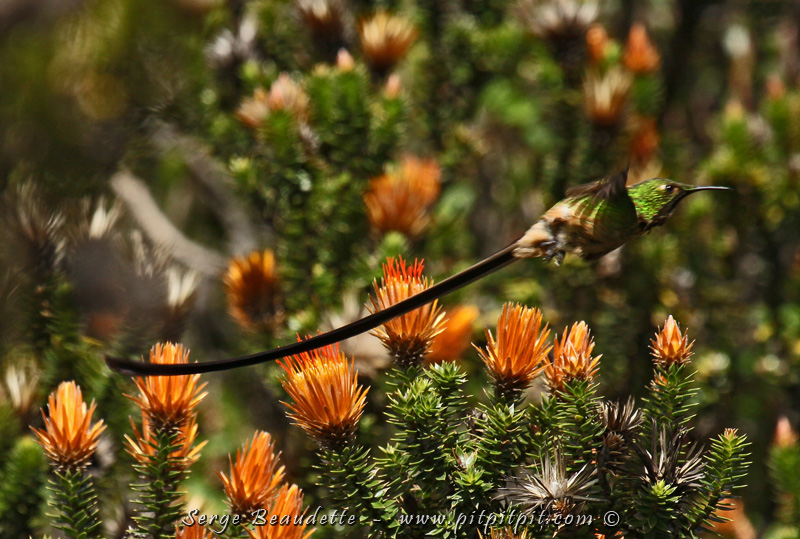 Aaahhh! C’est le son que j’entends chaque fois que nous découvrons, toujours de la même façon, ce Colibri hyper spectaculaire! Avant de le voir perché, il est toujours aperçu en vol, faisant de la haute voltige en allant très haut, pourchassant une femelle,… une « apparition », c’est le cas de le dire… et les gens, l’air de dire : « Est-ce que j’ai rêvé? C’est vraiment sa queue? » Oui!!! Ça impressionne énormément! (Porte-traîne Lesbie)