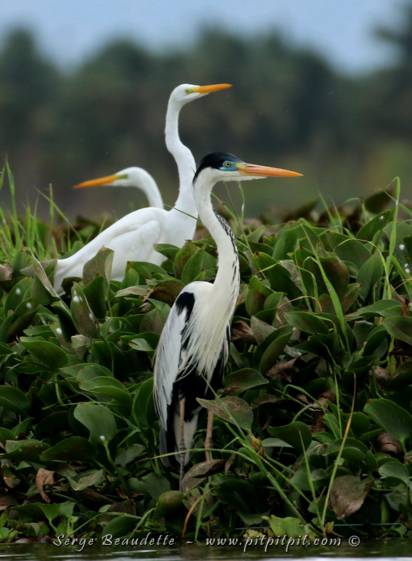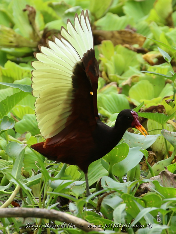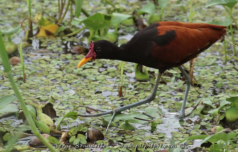Ici, de droite à gauche: le Jacana noir, le magnifique Ibis falcinelle avec son plumage iridescent, et… je vous laisse un peu de temps pour deviner… une jeune Talève violacée!