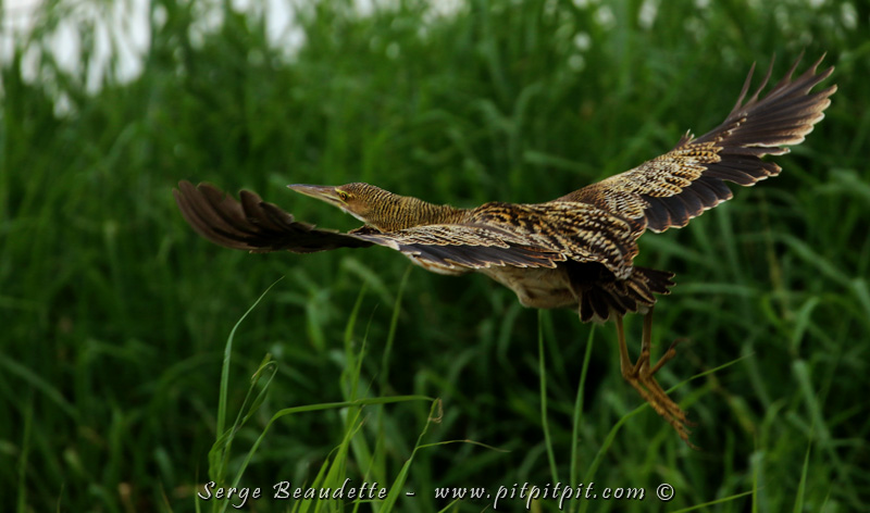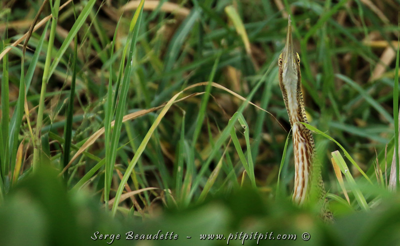 Il s’agit du Butor mirasol, un oiseau devenu extrêmement rare, une première pour moi il va sans dire!!! Nous le verrons de très très près… dans sa position classique, le bec pointant vers le ciel pour imiter les roseaux!