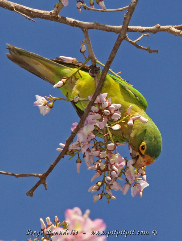 Mais la Conure à front rouge dans les fleurs…WOW!!!
