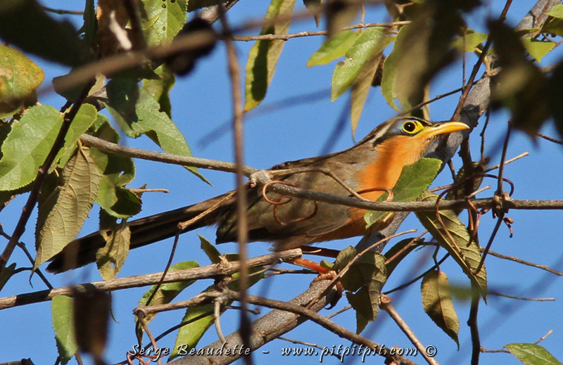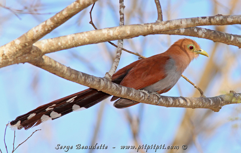 Enfin! Le Piaye écureuil habituellement abondant mais cette fois-ci, « absent » vient se pavaner devant nous, sautillant d’une branche à l’autre avec son impressionnante queue, cette façon de faire lui vaut merveilleusement bien son nom! …Et il siffle très fort. sur l’air d’un gars qui voit une demoiselle…