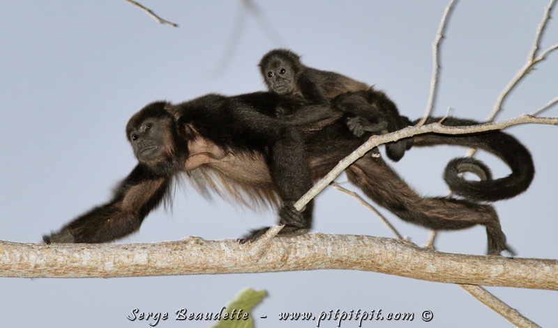 Au jour tombant, à la demande de mon corps qui avait besoin d’une bonne marche (…parce que nous marchons longtemps durant le jour mais jamais très vite tellement il y a d’oiseaux!), j’ai décidé de revenir à pied au Lodge… et j’ai croisé un groupe de Singes hurleurs avec entre autres 3 mamans avec leurs jeunes bébé…
