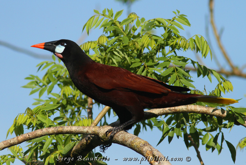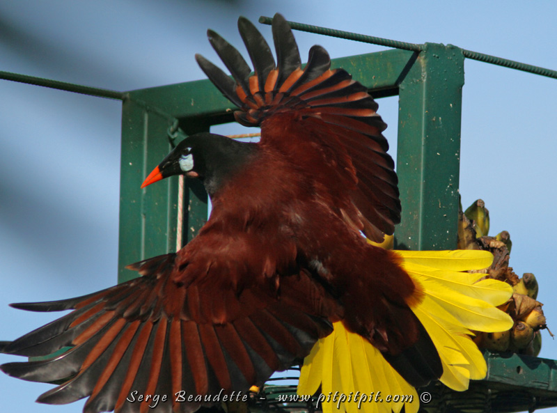 Le Cassique de Montezuma vient même dans les mangeoires à bananes! En vol, avec ses plumes jaunes à la queue, il fait toujours grande impression! (Il a un splendide masque aussi!)