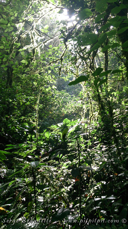 En moins de 20 minutes, nous passons de la forêt tropicale où le foin est jaune, desséché, les arbres ont perdu leurs feuilles, pour une région à la végétation luxuriante à l’extrême, aux arbres gigantesques pleins de mousses et où la brume et même la pluie sont abondantes!!!