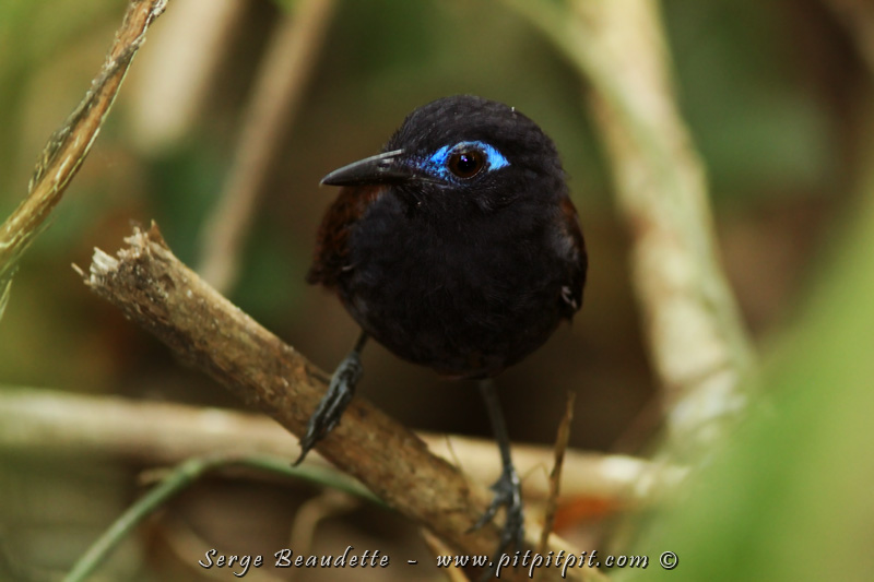 Un des moments forts de la matinée, c’est quand nous sommes « tombés » sur des milliers de fourmis légionnaires! Les fourmis légionnaires sont carnivores et mangent tout ce qu’ils trouvent jusqu’aux tarentules et aux scorpions, et même des mammifères!!! C’est grâce à la force du groupe et à leurs fortes, douloureuses et paralysantes injections d’acide formique, qu’elles y arrivent! Dès qu’elles arrivent quelque part, tous les fuient parce qu’ils les craignent au plus haut point! Un paquet d’insectes fuyant le même lieu est une aubaine recherchée par des oiseaux très spéciaux de plusieurs espèces, toutes associées aux mêmes familles qui commencent par « ant » (fourmis) : Antthrush, Antvireo, Antwren, Antpitta,… Impossible de voir ces oiseaux s’il n’y a pas de fourmis légionnaires! Parmis la dizaine d’espèces que nous verrons là, la plus commune : le bel Alapi à dos roux, avec son maquillage bleu à l’œil! Phénomène FASCINANT à observer!!! À noter que ces oiseaux n’ont rien à faire des fourmis… mais plutôt des insectes qu’elles font fuir!