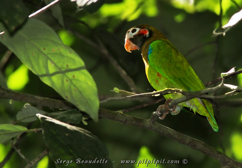 Un peu plus loin, j’entends un cri fort mais très irrégulier… un perroquet… un son que je n’ai pas souvent entendu… Des perroquets forestiers, il n’y en a pas beaucoup! EH OUI!!!! Un autre qui nous avait échappé… Nous croyions en avoir vu un en vol très haut, à contre-jour… mais pas assez certain. En plus de ne pas le voir souvent, quand nous y arrivons, c’est trop souvent trop vite et dans des conditions difficiles… mais là, il restera à « jaser » avec nous pendant au moins 20 minutes!!! Nous avons quitté avant lui! Il s’agit du Caïque à capuchon!!!