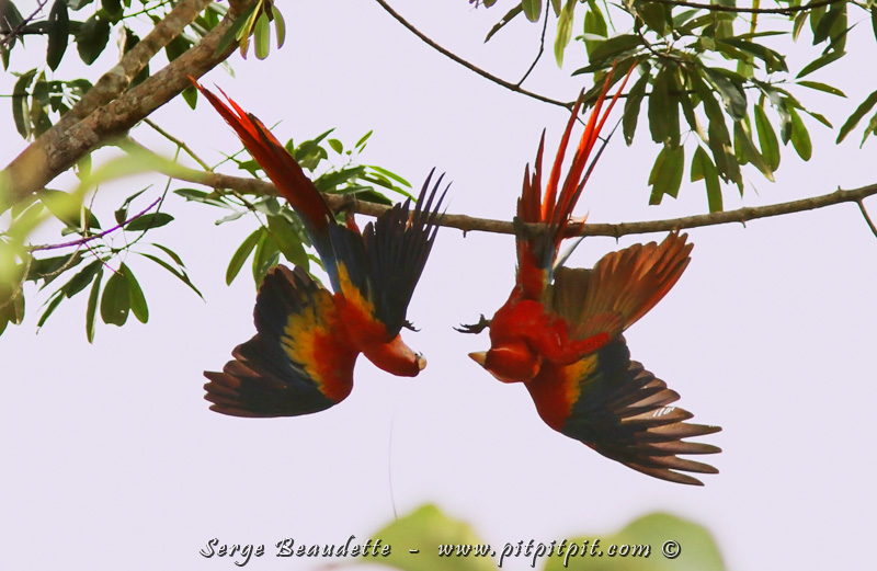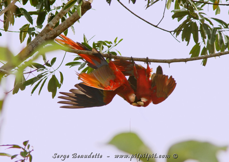 Suspendus, sans « cordage », ni « filet »!, un couple s’ébat toutes ailes déployées, chacun accroché par une seule patte… (Ara rouge)