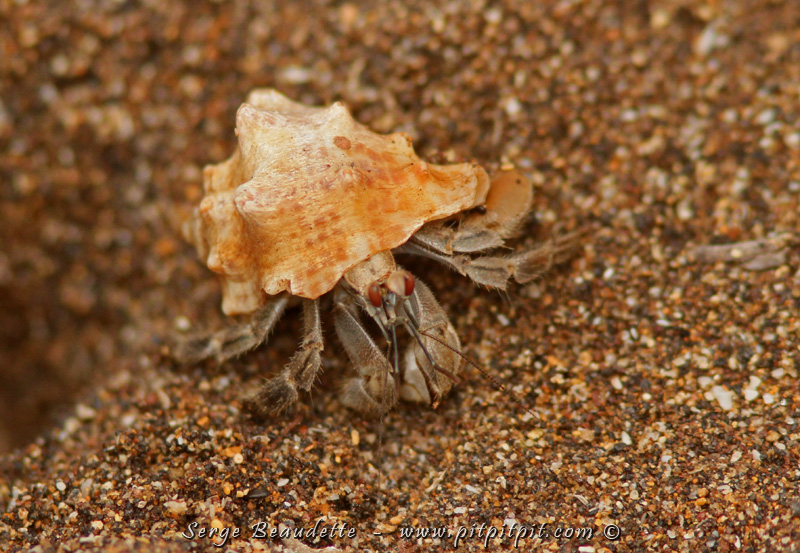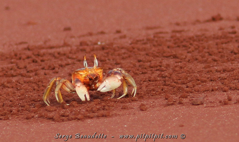 Une autre espèce de crabe nous fascinera un long moment: le «Ghost Crab» (Crabe fantôme)! …Fantôme parce que malgré sa grande taille, dès que nous approchons un tant soit peu, il disparaît subitement, en un éclair, dans son trou! Ses yeux se trouvent tout au bout de longs appendices, qui servent de «périscope»!