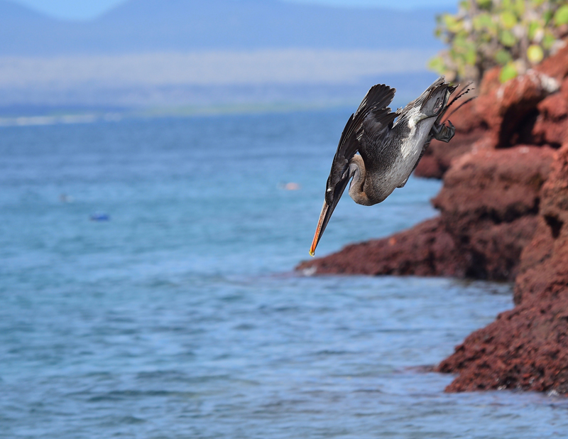 Sur cette même plage, les jeux d’un Pélican brun qui pêche en plongeant du haut des airs dans l’eau… et d’un Noddi brun qui se perche sur sa tête dès qu’il remonte, chaque fois sans exception, créent une distraction amusante! (Photo: Claire Bélanger)