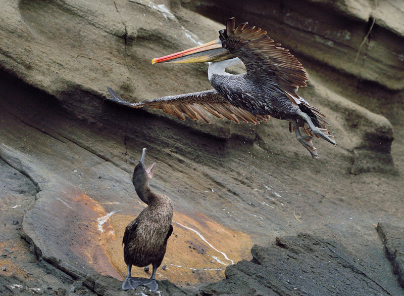 Interaction entre le fascinant Cormoran aptère et le majestueux Pélican brun (photo: Luc Simard)