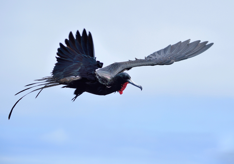 L’autre oiseau omniprésent en mer est la Frégate superbe! Pirate des mers, reine du vol (dans les 2 sens du mot!), elle peut suivre le bateau qui avance à 8 nœuds contre le vent pendant des heures et des heures, sans jamais battre des ailes une seule fois, en exploitant tous les courants d’air créés par la forme du bateau qui déplace l’air! (Photo: Luc Simard)